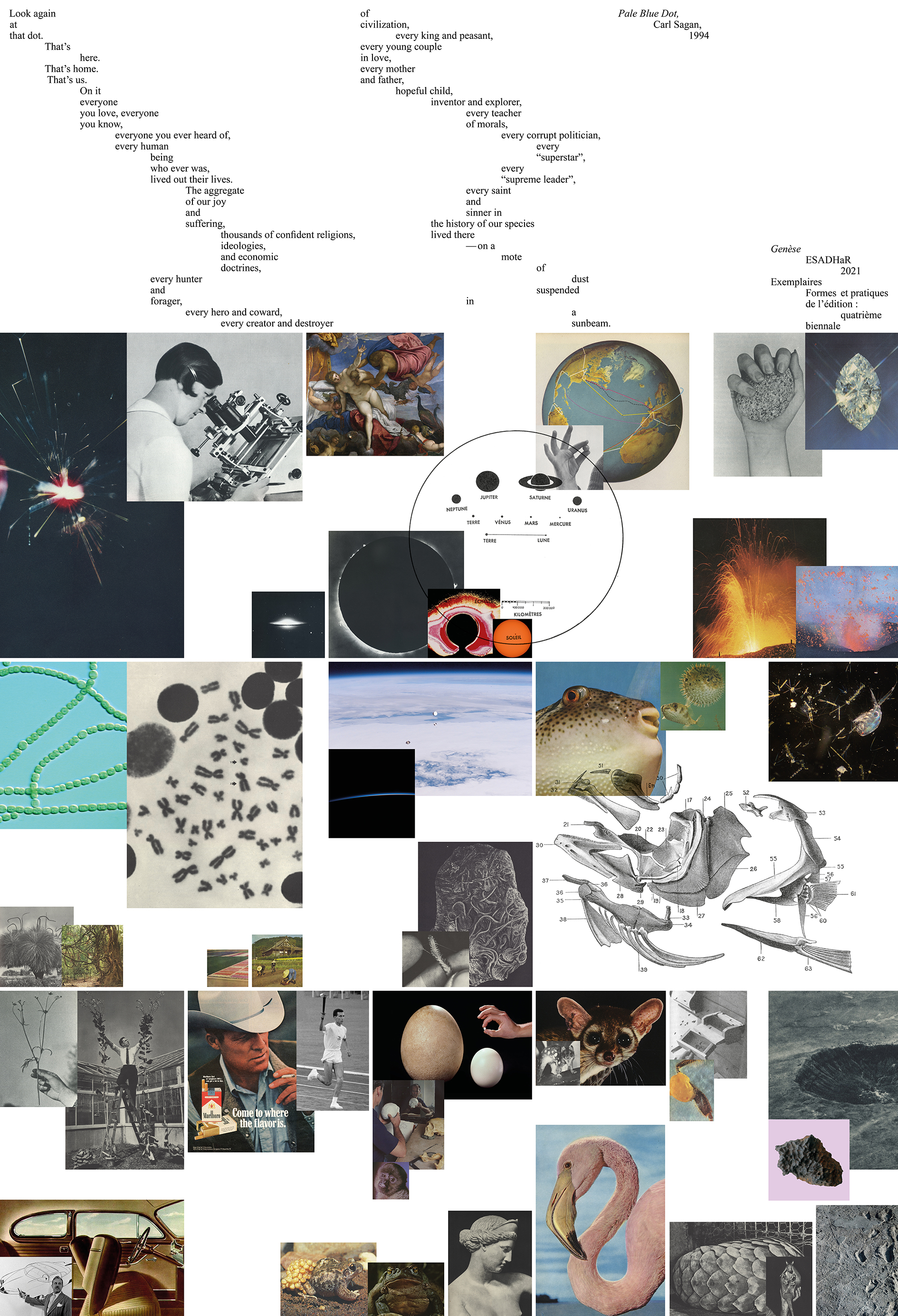 Dans le cadre de la biennale Exemplaires : formes et pratiques de l’édition 2021 à Toulouse, j’ai mise en page avec Johanna Ruysschaert, Manon Fargeat & Alain Rodriguez, toute l’iconographie de notre édition. La contrainte était de sélectionner 6 livres dans le but de les présenter sous une forme éditoriale, le thème de notre projet était la Génèse.