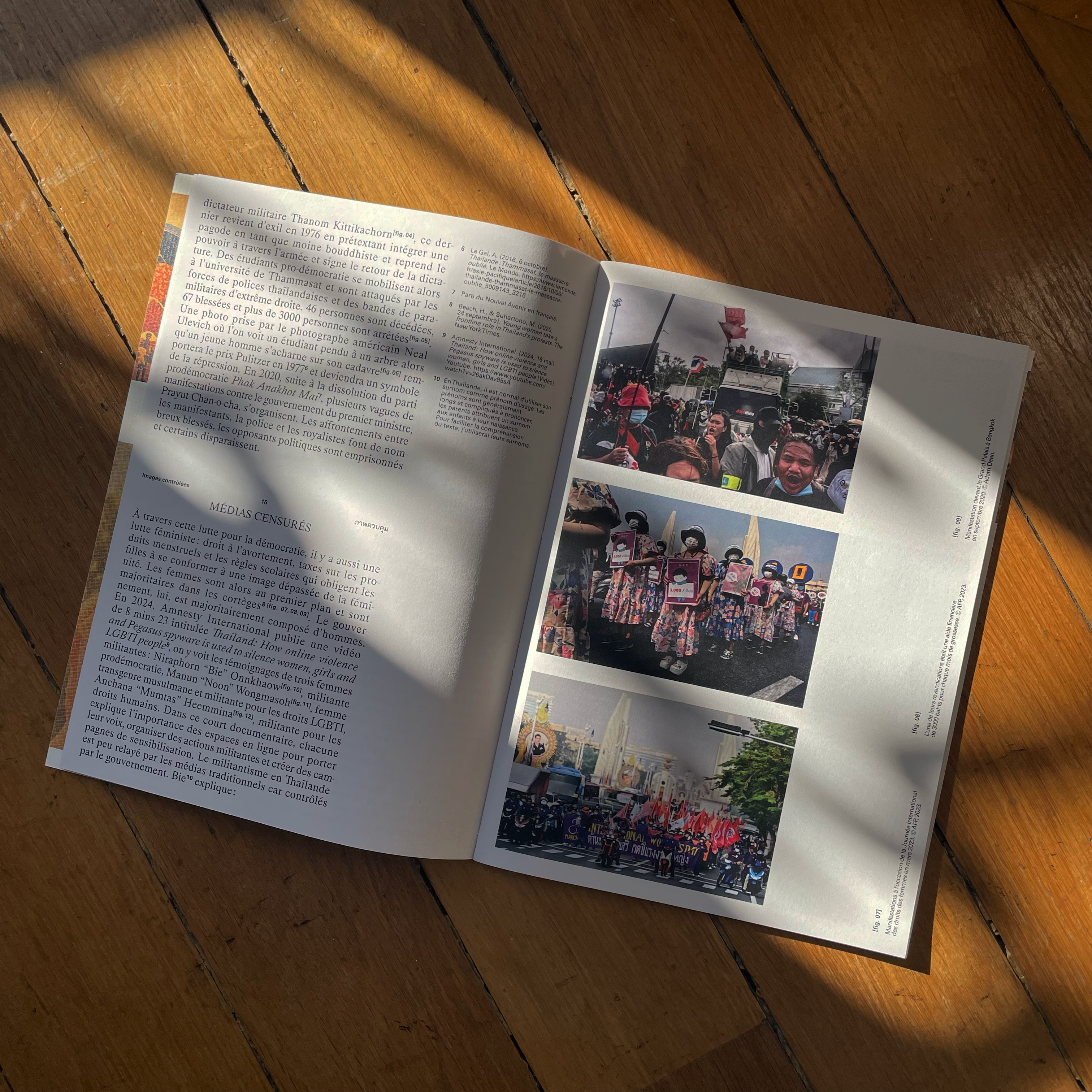 Tout est politique quand on est femme est une édition qui archive toutes les fois où les femmes thaïlandaises sont descendues dans la rue pour défendre leurs droits de 2004 à 2025. À partir d’images trouvés sur Internet dans la presse locale, internationale ou encore sur les réseaux sociaux, les manifestantes sont effacées afin de laisser place aux messages et surligner l’importance des mots dans la foule et dans la lutte. Chaque slogan a été traduit, daté et catégorisé selon la lutte.