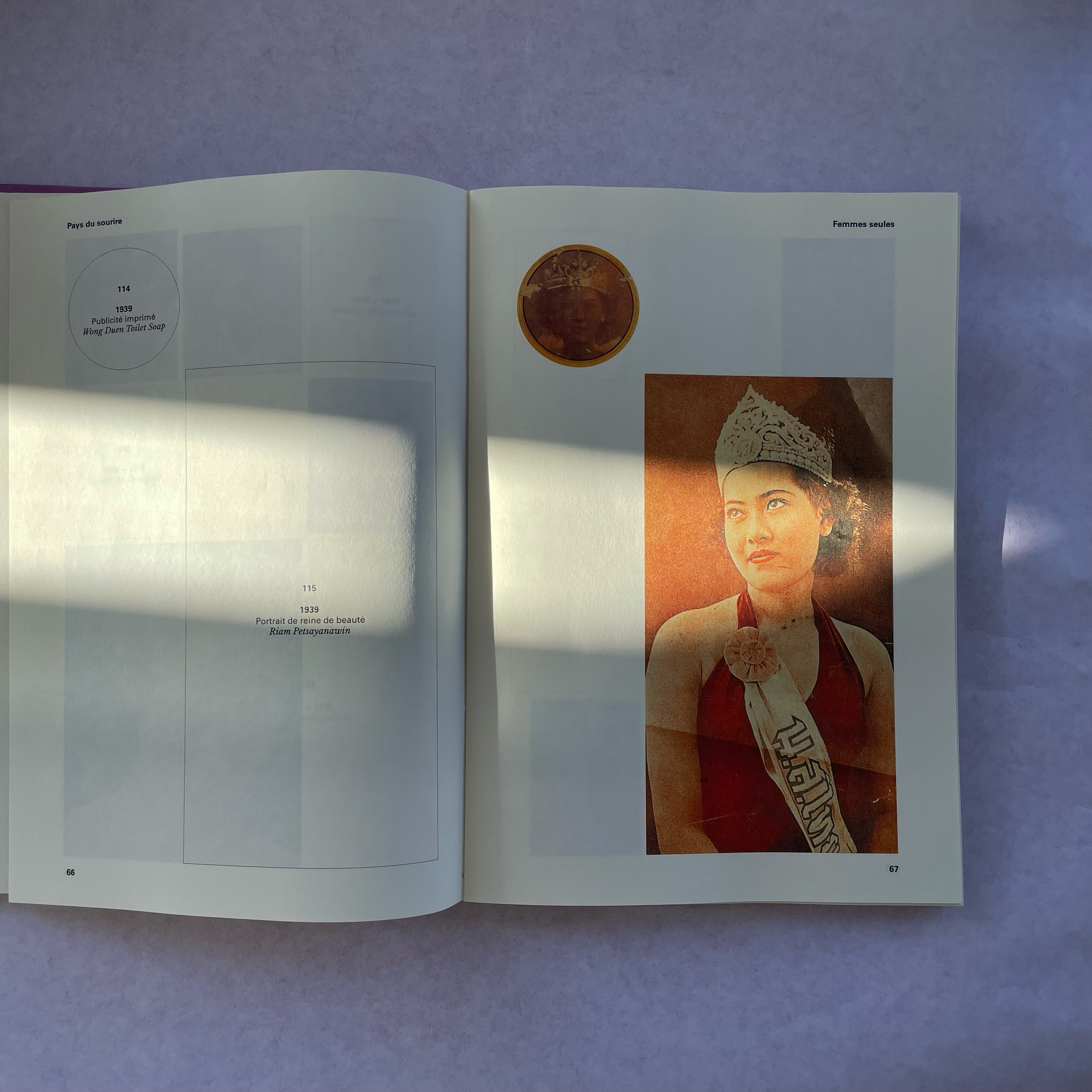 Dans Pays du Sourire (surnom que l’on donne à la Thaïlande) je me suis tournée vers la représentation des femmes thaïlandaises dans la communication visuelle en travaillant sur le livre A Century of Thai Graphic Design d’Anake Nawigamune paru en 2000. Ce livre regroupe plus de 5500 objets et images témoignant de l’histoire de la communication visuelle en Thaïlande. Il me semblait naturel de me tourner vers le passé pour essayer de comprendre le présent, commence alors une recherche sur les femmes dans ces différents supports de communication : poster de film, magazines, produit de beauté, médicaments. L’image des femmes est utilisé pour vendre ou promouvoir. Ces images, je les ai catégorisé, à la manière de Marianne Wex qui étudiait le langage corporel entre les hommes et les femmes en 1977 avec Let’s Take Back Our Space, j’ai voulu voir comment les femmes étaient représenté lorsqu’elles étaient seules, avec un ou des hommes, ensemble et avec la famille. J’ai constaté alors que les femmes étaient souvent dans des positions d’admiration ou de soumission lorsqu’elles sont représentées avec des hommes, parfois même agressées, des objets de désir et toujours souriantes lorsqu’elles sont seules, maternelles et douces en famill et en compétition ou rivales lorsqu’elles sont ensembles. Dans cet atlas d’images, il y a un jeu de miroir entre les pages, celles de gauche permettent de connaître le support sur laquelle l’image se trouve originellement ainsi que la date et sur la page de droite, l’image en question.